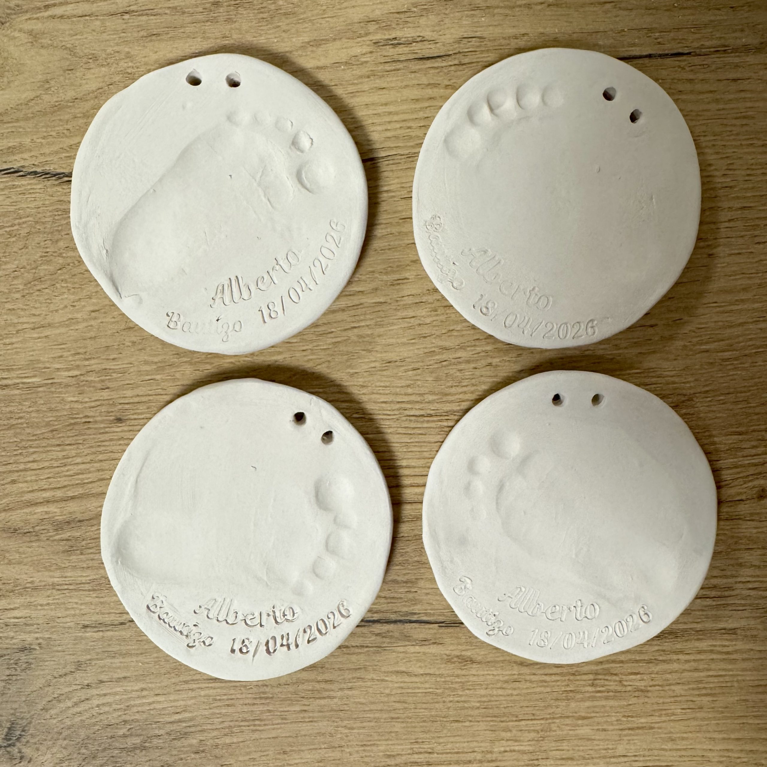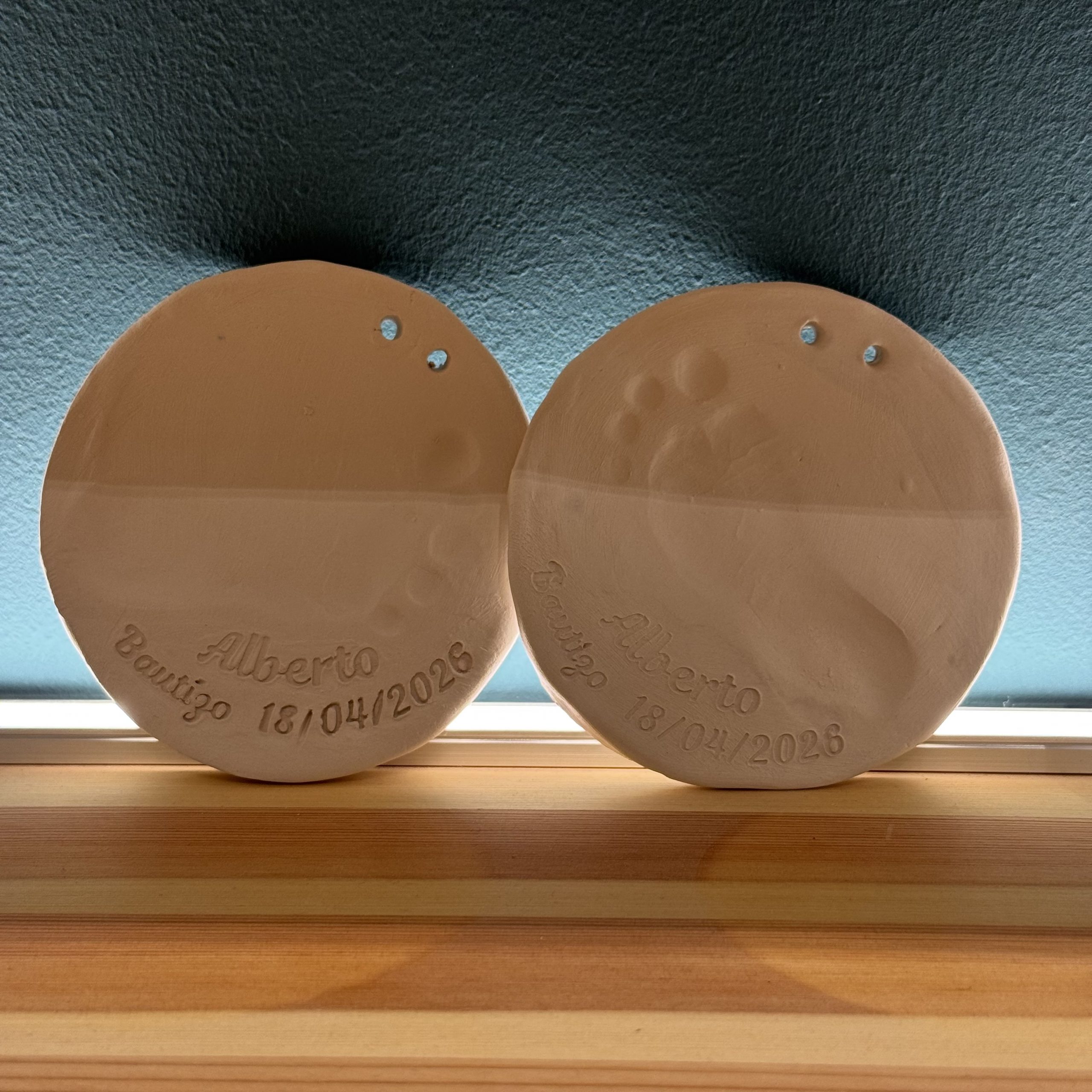 En MOSAÏQUE también te ofrecemos la posibilidad de crear un adorno de cerámica donde se puede plasmar una de las huellas del bebé en nuestro taller de Valladolid.